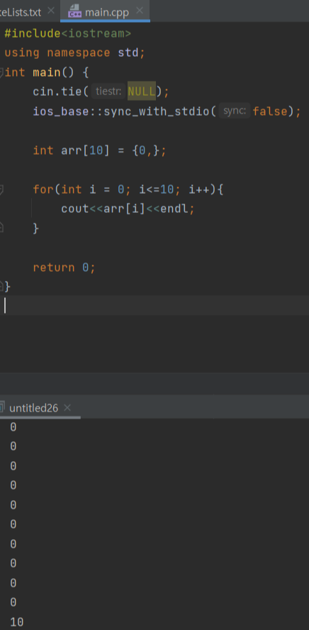 int arr[10] = {0,} 이런식으로 선언을 하면 이 arr 배열의 모든 성분이 0 으로 초기화 됩니다!
