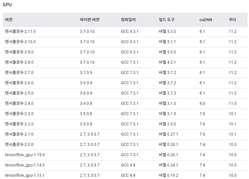 위 링크에 들어가시면 아래와 같은 표가 있는데요. tensorflow 버전에 맞는 cuDNN, 쿠다 버전을 확인하실 수 있습니다.