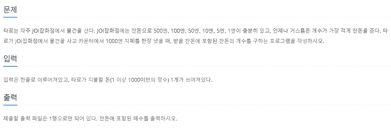 타로는 자주 JOI잡화점에서 물건을 산다. JOI잡화점에는 잔돈으로 500엔, 100엔, 50엔, 10엔, 5엔, 1엔이 충분히 있고, 언제나 거스름돈 개수가 가장 적게 잔돈을 준다. 타로가 JOI잡화점에서 물건을 사