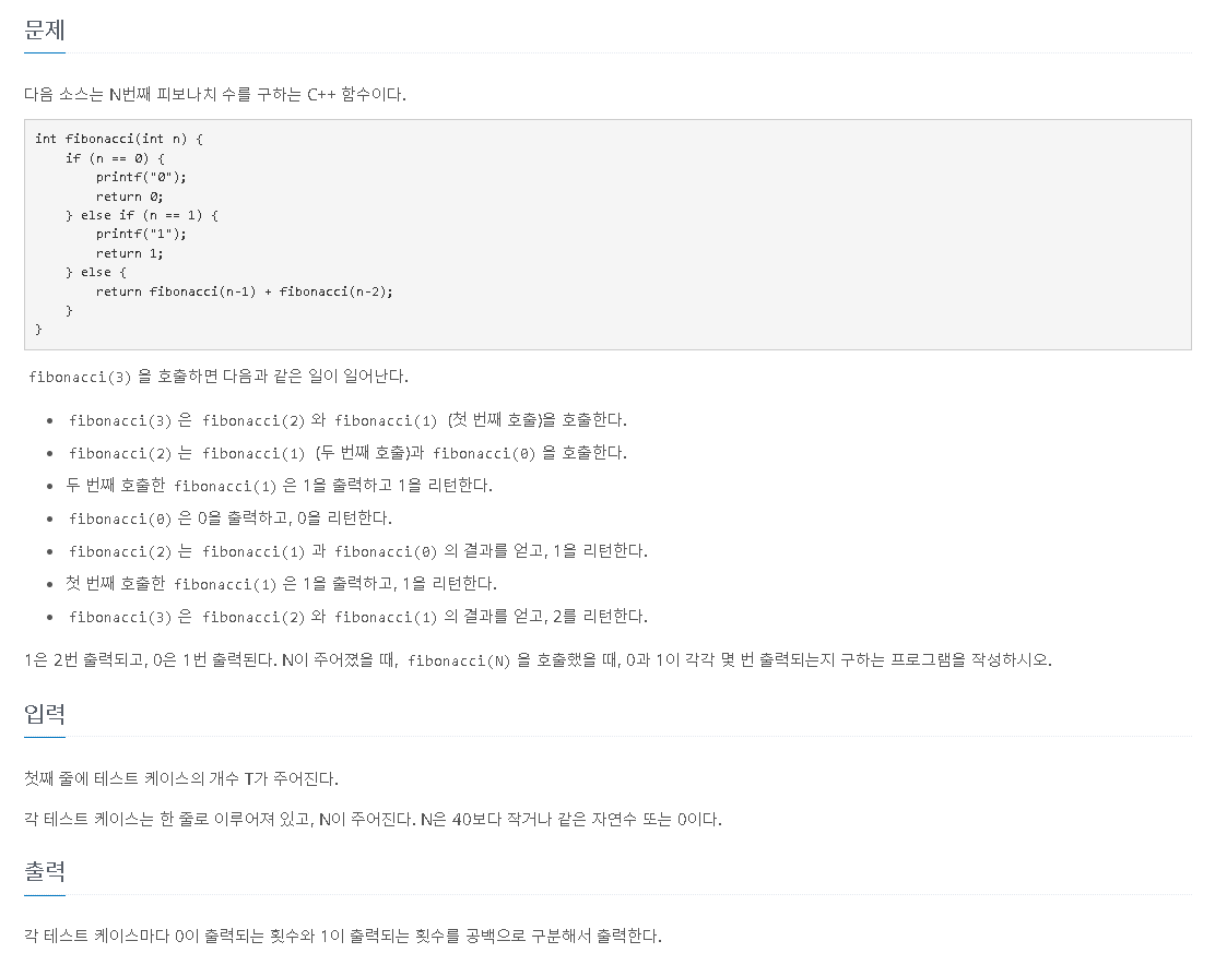 input N이 주어졌을 때 0, 1이 출력되는 횟수를 구해서 출력하는 문제입니다.