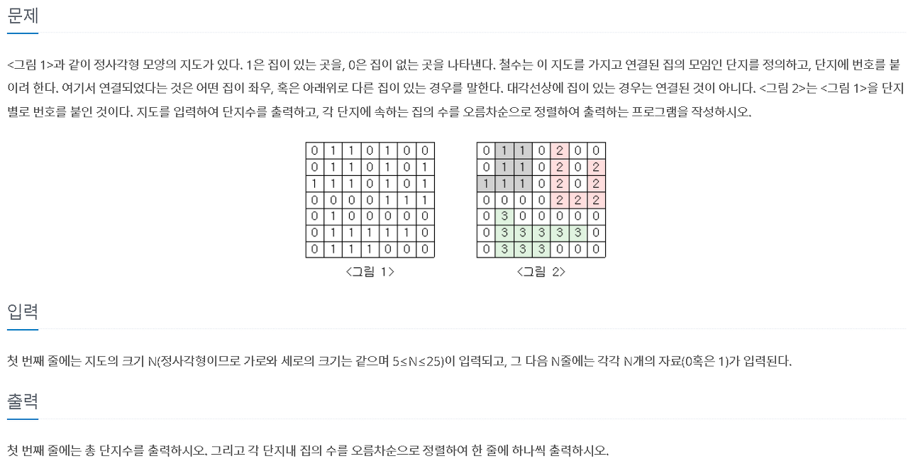 <그림 1>과 같이 정사각형 모양의 지도가 있다. 1은 집이 있는 곳을, 0은 집이 없는 곳을 나타낸다. 철수는 이 지도를 가지고 연결된 집의 모임인 단지를 정의하고, 단지에 번호를 붙이려 한다. 여